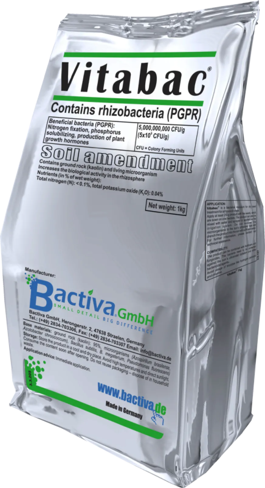 Vitabac® is a bacterial soil and root inoculant for all plant species. The product is of a powdery texture and available as a standard or a five times concentrated blend. The bacteria colonize the root surface and the immediate adjacent area, the rhizosphere. The bacteria fix atmospheric nitrogen in the soil and solubilize bound phosphates, to make them available to plants. They also produce plant growth hormones that stimulate root growth (Gibberellins and Cytokinins).